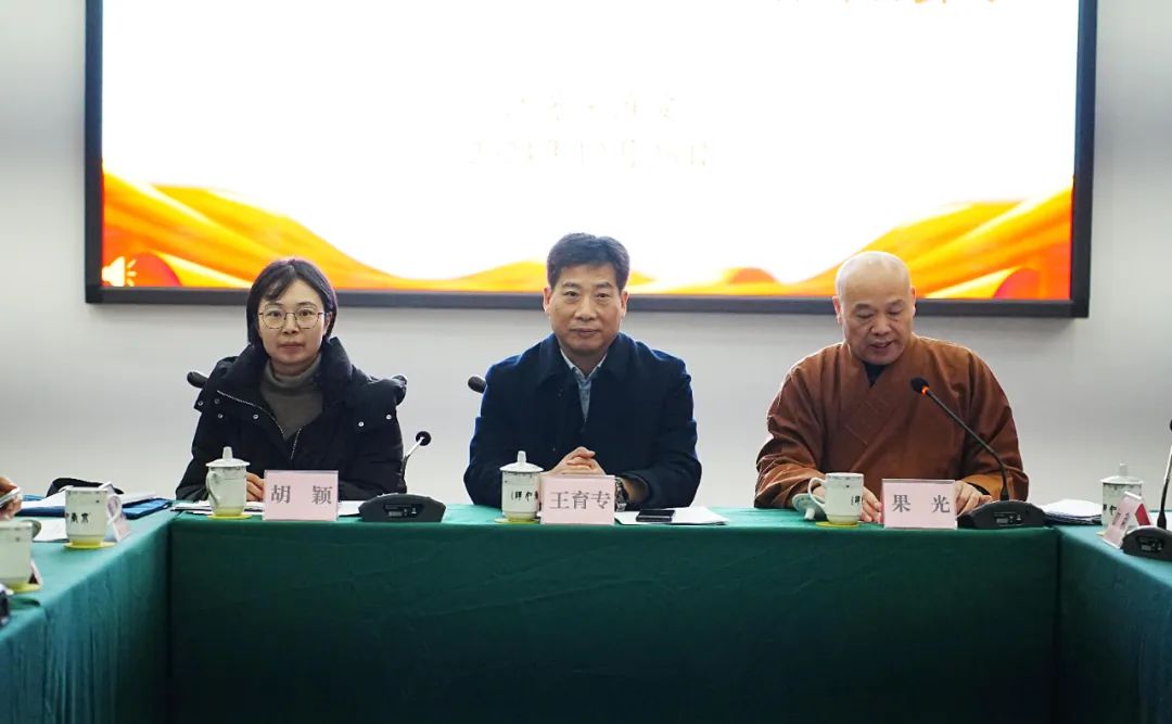 会议总结了淮安市佛教协会2024年工作,研究部署了2025年计划;传达了省佛协年终总结会议精神;学习了中佛协《关于规范进入佛教活动场所着装提醒工作的提示》《关于进一步加强佛教场所活动管理的通知》、省佛协《江苏省佛教协会内部资料性出版物审读管理规定(试行)》《江苏佛教教职人员认定管理实施细则》;各副会长进行了述职交流发言。果光会长在总结讲话中表示,一年来,市佛协着力加强思想政治建设,推进淮安佛教中国化实践,在加强人才培养、开展公益慈善、推动对外交流等方面也做了大量的工作,圆满达成了年初确定的工作目标。2025年市佛协要继续坚持以习近平新时代中国特色社会主义思想为指导,提高政治站位,坚持从严治教,坚持守正创新,坚持回报社会,坚持学修结合、坚持交流互鉴,坚持场所各项安全管理。希望大家团结一致、锐意进取,谋长远之策,行固本之举,团结佛教界人士和广大信众,坚持佛教中国化方向,继续创建文明寺院、和谐寺院、文化寺院和生态寺院,提升场所管理的法治化、规范化水平,不断推动淮安佛教事业迈上新台阶。王育专对淮安市佛教协会过去一年在团体建设、人才培养、寺院管理等方面取得的成绩给予肯定,同时也指出了淮安佛教面临的一些形势以及存在的问题与不足。他要求市佛协要夯实“三爱”根基,坚持政治引领,推进淮安佛教中国化方向,坚持全面依法从严治教,不断加强团体建设,开创淮安佛教事业新局面,为中国式现代化淮安实践作出应有贡献。