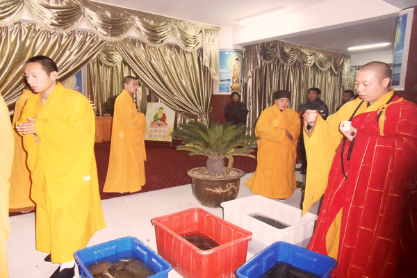 2013年12月19日(农历十一月十七日)上午9时30景会寺举办慈悲放生法会,佛闻法师带领四众弟子为水族生灵虔诚说法,诵大悲咒、往生咒加持,并为其皈依佛、法、僧三宝。之后,法师为即将放生的水族洒净,善信居士一起将生灵放生里运河,并回向水族众生,愿三宝威德加持护佑,所放生物获尽天年,临命终时,乘佛愿力,往生极乐。同时,愿捕生人等解冤释结,回心向善,消灾免难,护生救生,发菩提心,行菩萨道。